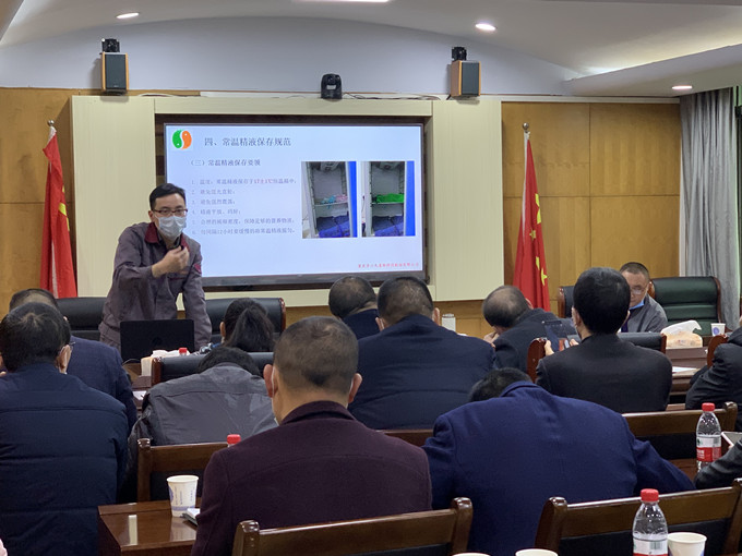 此次培訓會由區畜牧中心生產區站陳勇站長和重慶69國家生豬核心育種場場長、國家生豬產業技術體系重慶試驗站站長蒲強主講,會上就豬常溫精液安全生產、母豬發情鑒定、生豬人工授精技術、常溫精液保存規范等生豬人工授精技術要點進行了講授。