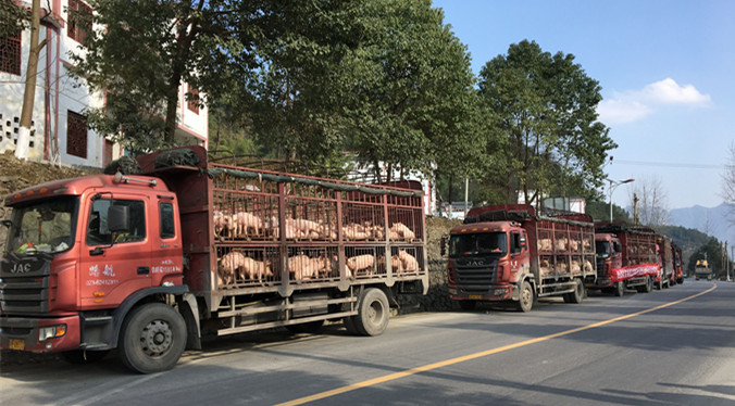 在豬場的上豬臺及外面的大路上,幾輛大貨車排成一排,豬叫聲和工人的吆喝聲此起彼伏,好不熱鬧!